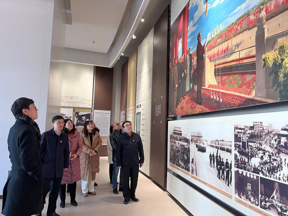 南京宪法主题公园由旗阵广场、宣誓广场、主题雕塑、宪法宣传教育展等板块组成,是南京市根据各级人大代表建议建成的宪法主题市民公园,并被司法部命名为“全国法治宣传教育基地”。一行人穿过庄严的旗阵广场来到宪法公园的核心部分“宪法宣传教育展厅”,沿途的宪法石碑和纪念雕塑无一不彰显着宪法作为国家根本法的价值与光辉。在讲解员的引导和介绍下,大家详细了解了宪法的起源及演变过程,从1954年首部人民宪法在中国共产党的领导下诞生,为中国人民提供了平等、自由、民主的法治基石,到现行“八二宪法”的颁布及五次修订,通过中国共产党领导中国人民寻宪、制宪、修宪、奉宪的伟大历史进程,大家进一步理解了“宪法是党和人民意志的集中体现”的深刻内涵。