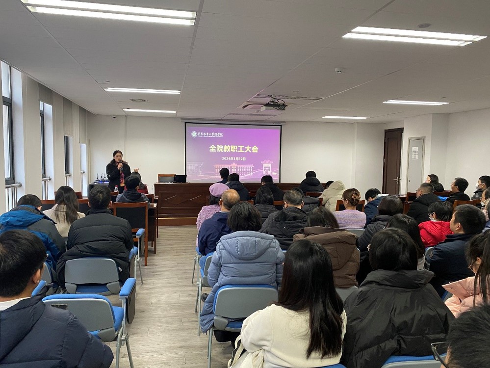 2024年1月12日上午,云顶国际在9A404会议室召开全院教职工大会,会议由公司党委书记赵安珍主持。